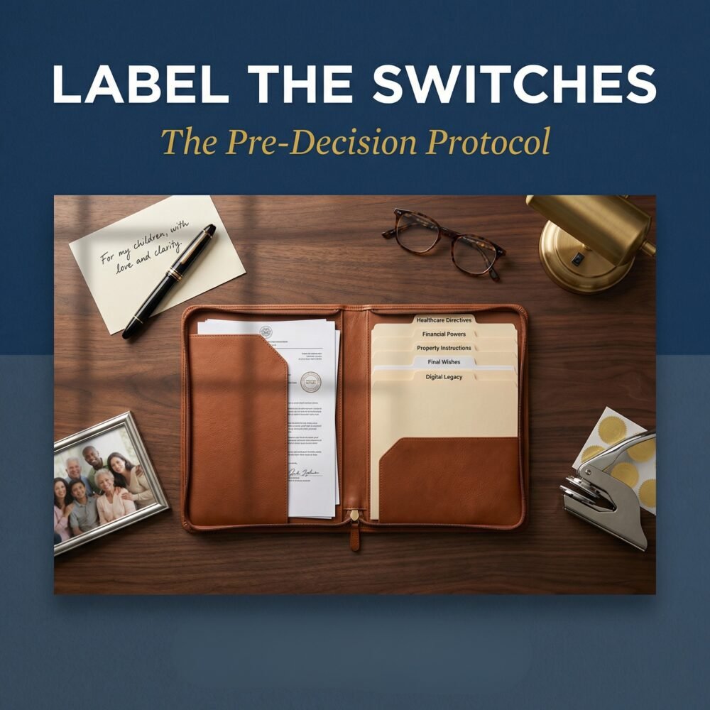 The protocol walks you through identifying every major decision point in aging, from the medical choices nobody wants to discuss to the financial priorities your kids don’t know about to the personal wishes that die with you if you never voice them. Then it shows you how to label each switch clearly, create backup systems, and document everything in a way that transforms panic into peace.